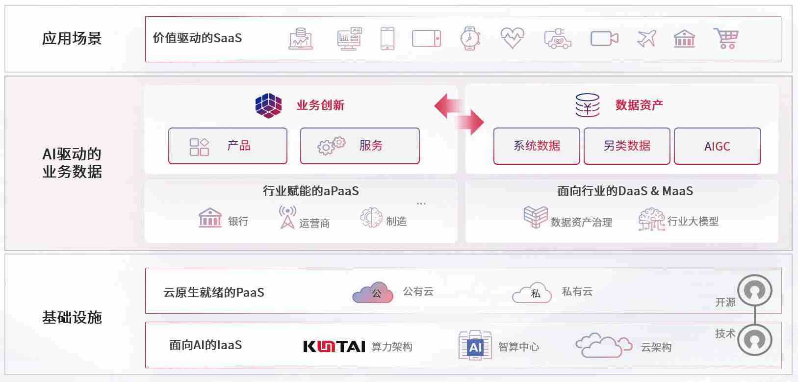 数字时代,,,围绕企业数字化转型的关键要素,,壹号娱乐数码开创性的提出数云融合战略和技术体系框架,,,着力在云原生、、、、数字原生、、、AI原生和信创产业上架构产品和服务能力,,,为处在不同数字化转型阶段的快消零售、、、汽车、、金融、、、医疗、、、、政企、、、、教育、、、、运营商等行业客户提供泛在的敏捷IT能力和融合的数据驱动能力,,构建跨界融合创新的数字业务场景和新业务模式,,助力企业级客户建立面向未来的核心能力和竞争优势,,,全面推动社会的数字化、、智能化转型升级。。。