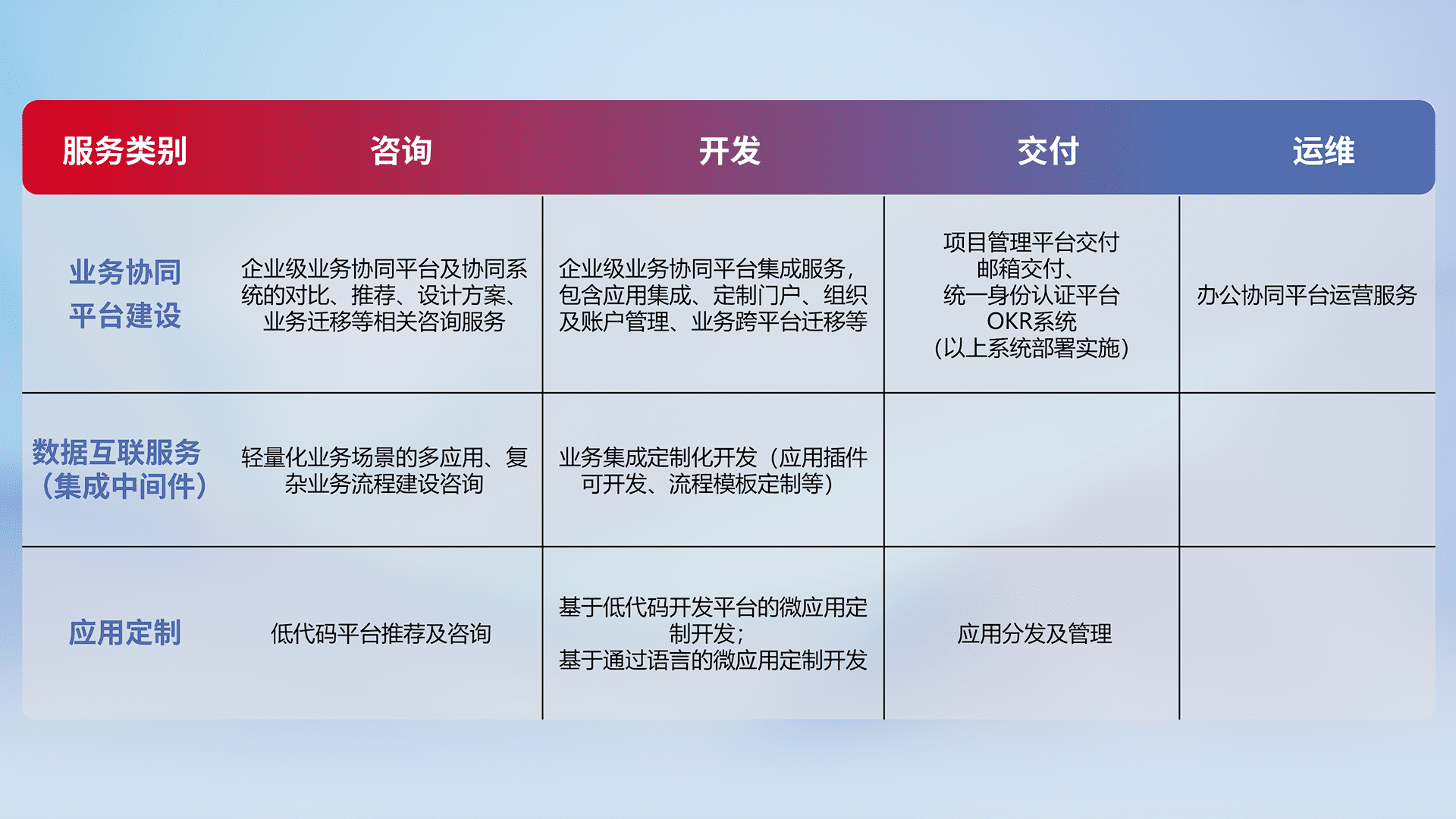 针对钉钉、、企微、、、IDaas等平台级产品提供产品的规划、、方案、、、、交付、、定制化开发等服务,,,,实现如统一协同办公、、智能客户服务、、混合会议管理、、、智能数据查询、、、、等业务场景,,实现数字化转型。。。。